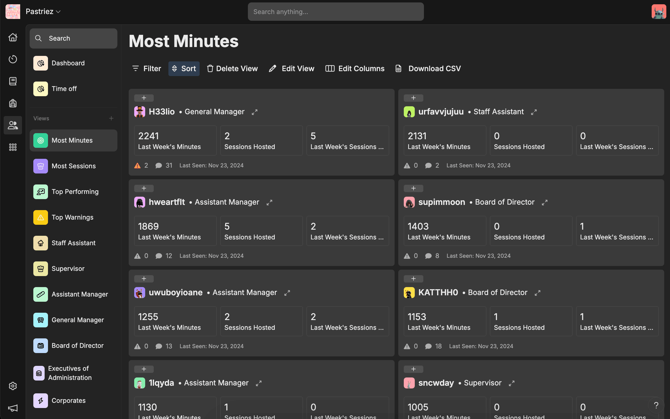 Stop guessing who your best staff are. Hyra automatically tracks activity, manages sessions, and surfaces the insights you need to build an unstoppable team.